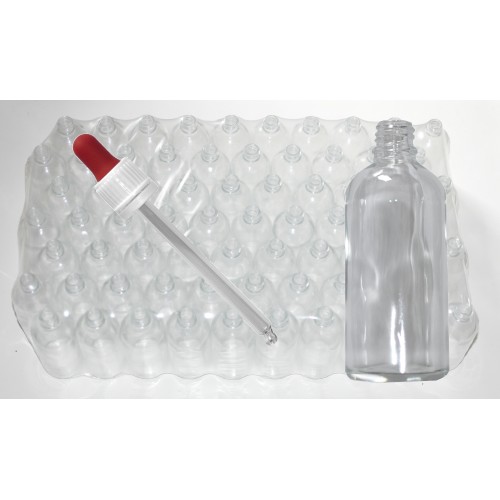 100 ml medicijnflesjes met pipetten en verzegelring, per verpakking 70 stuks.