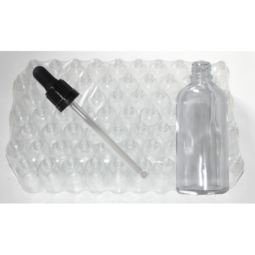 100 ml medicijnflesjes met pipetten en verzegelring, per verpakking 70 stuks.